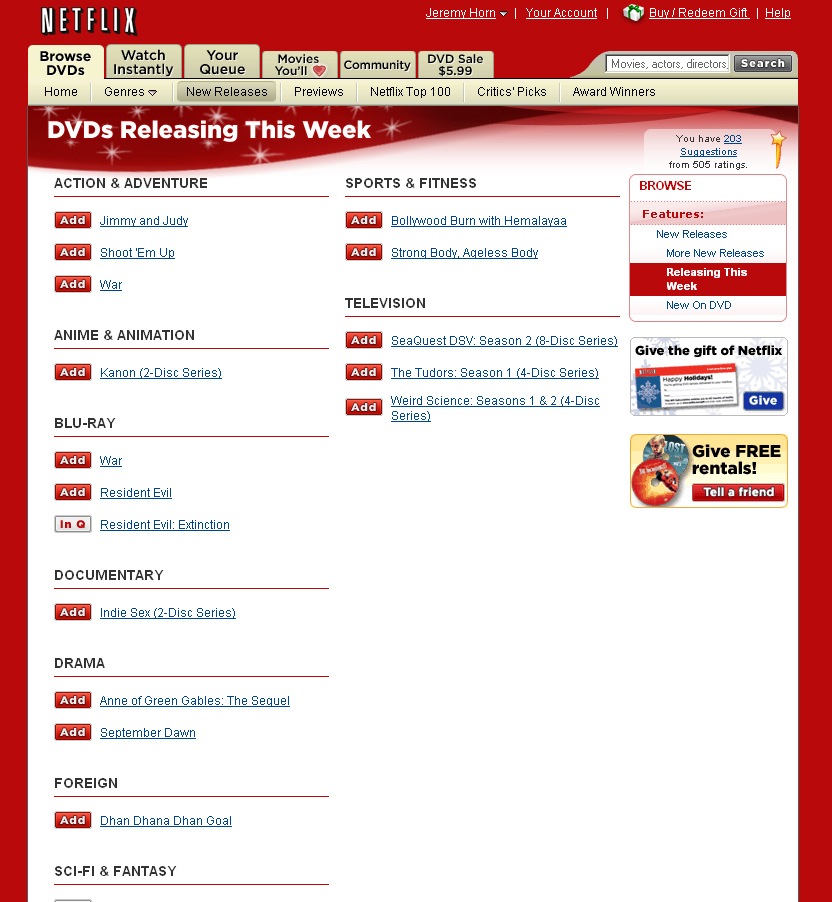 So, stop forcing your customers to browse the virtual DVD shelves and bring back the old interface. I am sure everyone is open to something better, something that helps people do what they want to do at Netflix: get a new movie, see what is coming out. Your customers, myself included, don’t want to stroll the Netflix “aisles” in the hopes of stumbling upon something.