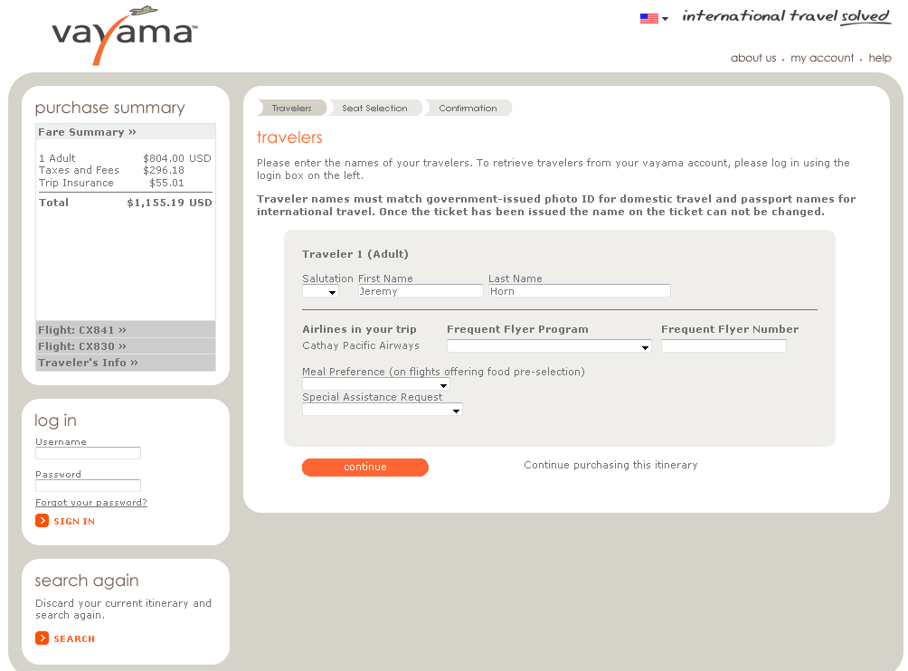 Vayama has combined all of these commonly separate pages into a single user interface that adapts as the user interacts with it. It isn’t until the user has to specify the travelers, select the seats, and pay for the tickets, that they even have to leave the homepage of the site.