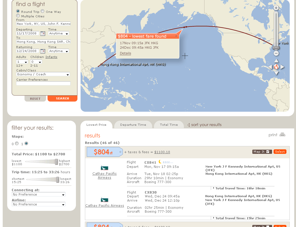 The initial search form alongside the search results makes one think that they can change anything on the page and alter the results. However, this is not the case. Search results pages typically present all of the controls that will filter and impact those results. The unique presentation and process at Vayama, result in different behaviors and set of expectations, requiring some finesse, poking, and interaction to adjust to this paradigm shift in travel planning.