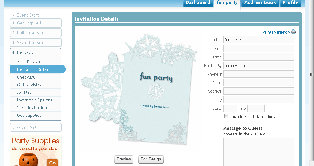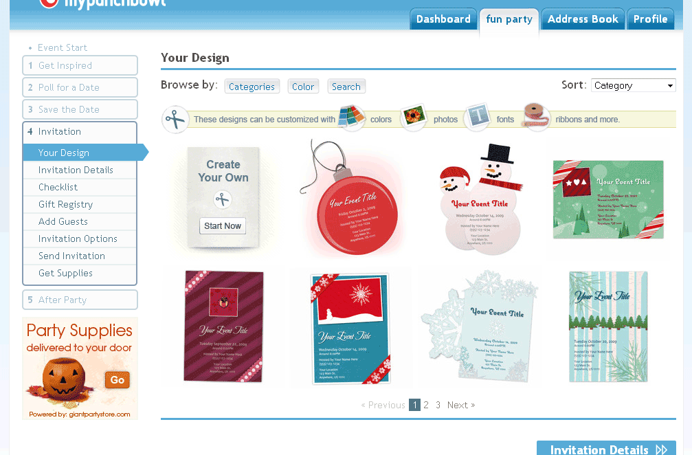 It isn’t until the user gets to the ‘Your Design’ stage that they are presented with a very recognizable interface for guiding them through the remainder of the event creation process.