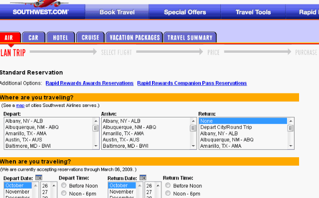 … a significantly more complex interface than is presented by ‘Book Travel.’ You can accomplish the same tasks (in a much more complicated manner) here as you could have done on ‘Quick Travel,’ but with no logical, consistent connections between the two options. Furthermore, when looking at this form, it appears completed unrelated, almost as if originating from a completely different website, to the ‘Book a Flight’ form – both geared to getting you to purchase airline tickets for use on Southwest Airlines.