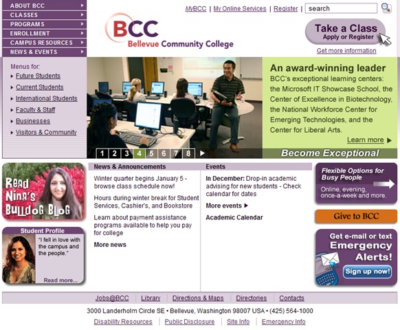 Bellevue Community College‘s website presents an online experience that takes at least a few moments for both the new and somewhat familiar visitor to orient themselves and identify the important content and action elements of the page, resulting in this product being today’s example of Fair Visual Hierarchy.