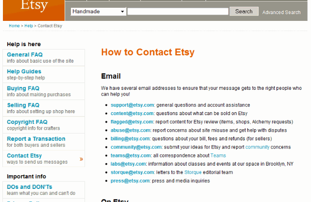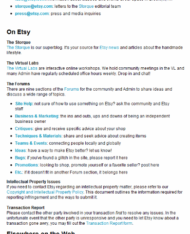 Etsy provides a plethora of channels by which users can reach out to the people behind the product. Beyond the exhaustive list of departmental email address, this product allows people to communicate ‘On Etsy’ through forums and the blog…
